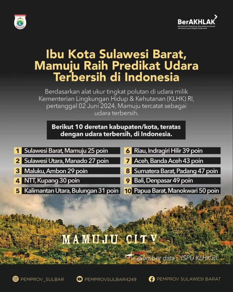 Mamuju yang berpenduduk 280 ribuan lebih boleh berbangga. Sebab pada tahun ini, ibu kota provinsi Sulawesi Barat tersebut kembali menyabet sebagai kabupaten/kota dengan udara sehat dan terbersih di Indonesia. Sekaligus mempertahankan atas capaian yang diraih pada tahun 2023.