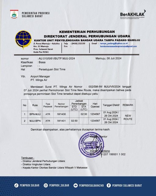 Hari ini Senin, 8 Juli 2024 Pemprov Sulbar telah mendapat surat tembusan dari Kementerian Perhubungan RI atas persetujuan pembukaan jalur Sulbar – Kaltim. Sebelumnya juga pihak PT Wings Air bermohon penambahan penerbangan sesuai permohonan slot time new rute dari Kementerian Perhubungan ke pihak maskapai.